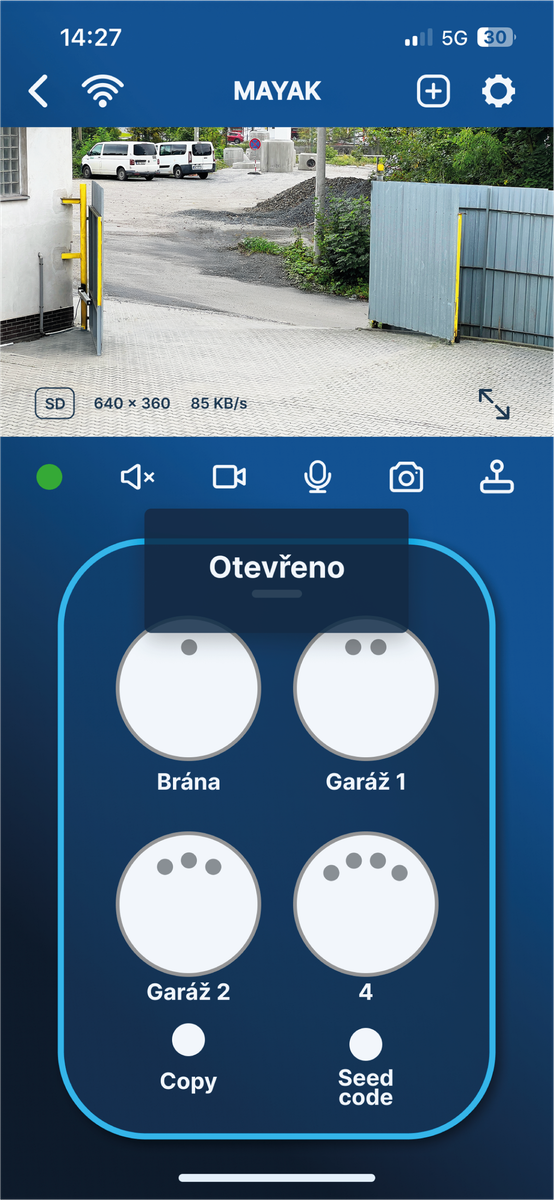- Tlačítka – Pokud se k ovladači nemůžete z jakéhokoliv důvodu připojit, můžete vrata ovládat pomocí fyzických tlačítek na ovladači samotném.
