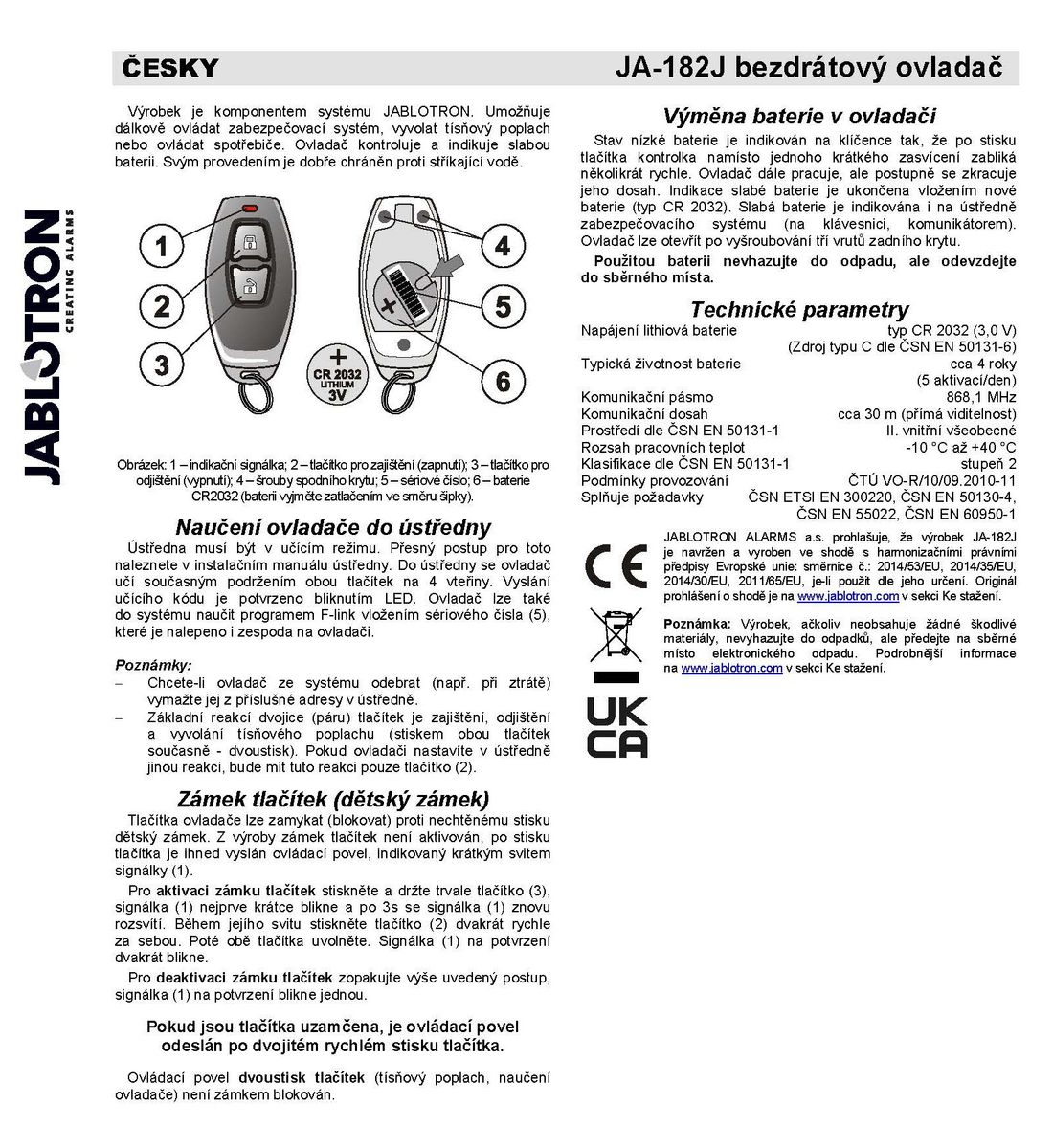 Značkový originální dálkový ovladač JABLOTRON JA-182J, CA-2103 (JA182J, CA2103).