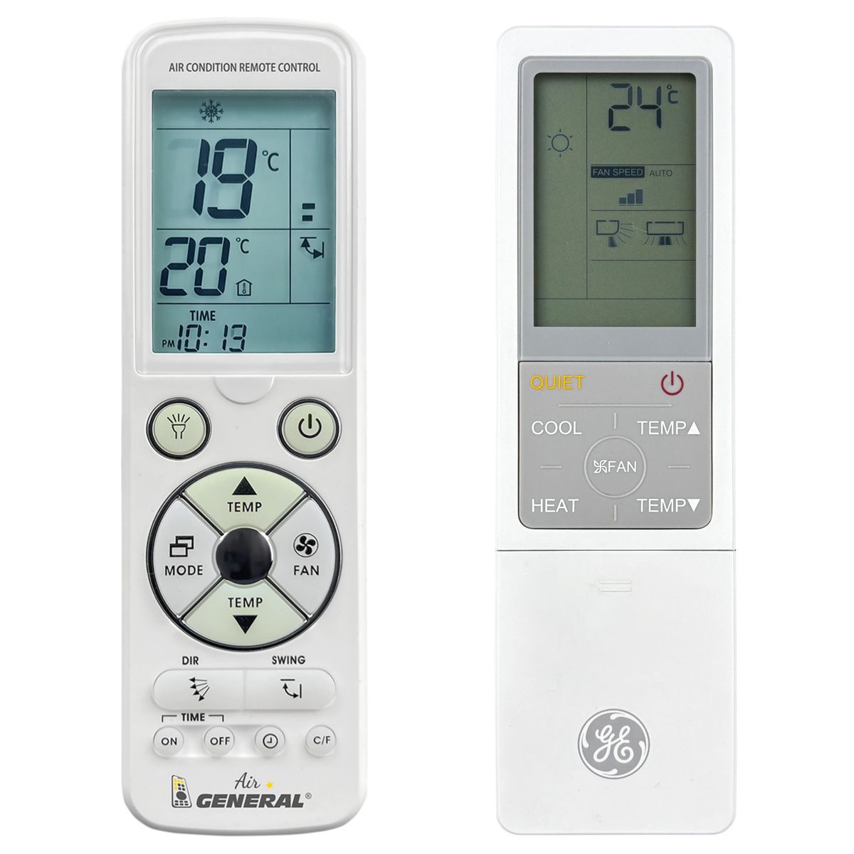 Ovladač je dodáván ve verzi dálkového ovladače General AIR Luxury (zobrazen vlevo), který byl navržen speciálně pro klimatizace GENERAL ELECTRIC. Garantujeme Vám, že dostanete ovladač, který plně nahradí Váš původní originální ovladač a bude mít všechny funkce. Ovladač již není potřeba párovat nebo kódovat. Obdržíte od nás ovladač, který je připraven k použití – jediné, co musíte udělat, je vložit baterie a ovladač hned funguje.