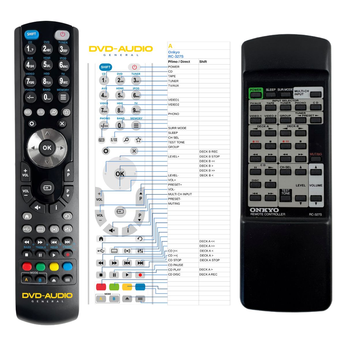 Ovladač je dodáván ve verzi značkového dálkového ovladače General DVD/AUDIO (zobrazen vlevo). Garantujeme Vám, že dostanete ovladač, který plně nahradí Váš původní originální ovladač a bude mít naprosto všechny funkce stejné.