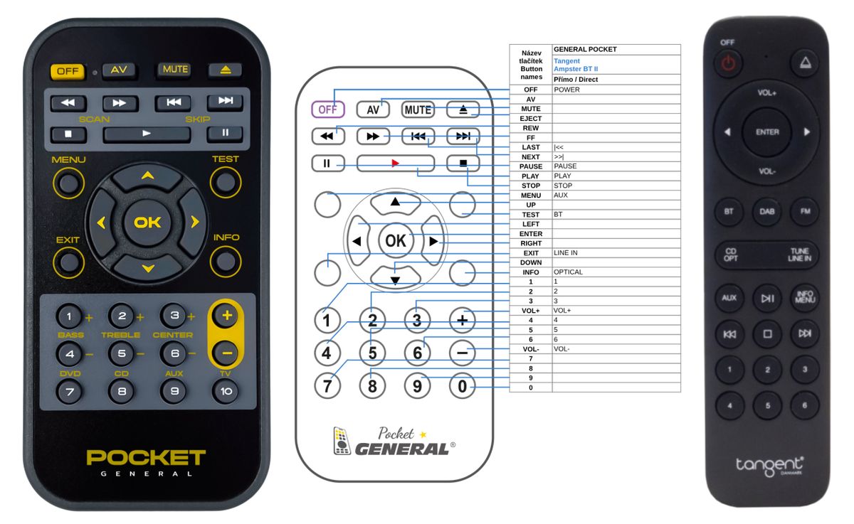 Ovladač je dodáván ve verzi značkového dálkového ovladače General POCKET (zobrazen vlevo). Garantujeme Vám, že dostanete ovladač, který plně nahradí Váš původní originální ovladač a bude mít naprosto všechny funkce stejné.
