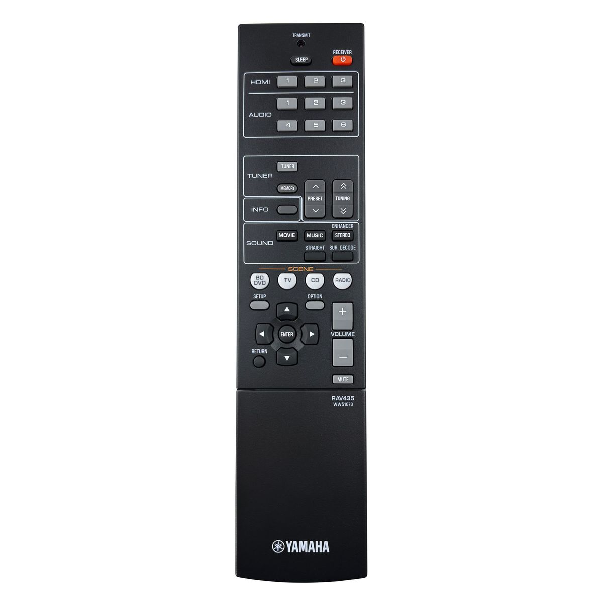 Značkový originální dálkový ovladač YAMAHA RAV435, WW51070, HTR-2064, HTR-2070, YHT-196 (RAV435, WW51070, HTR2064, HTR2070, YHT196).