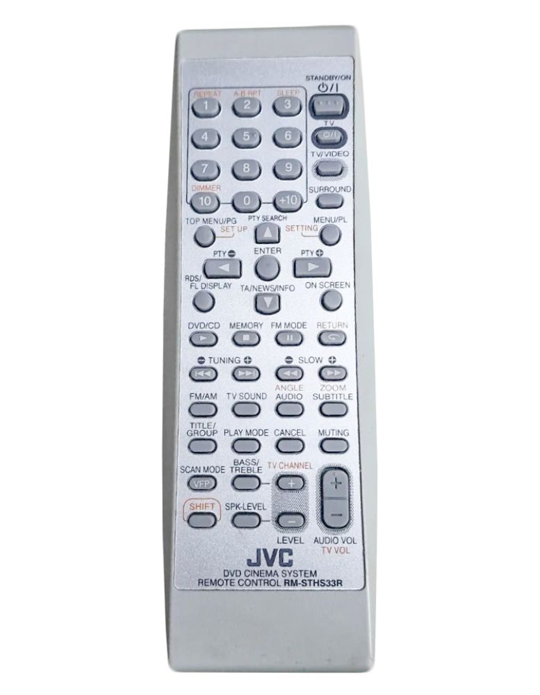 Dálkový ovladač JVC RM-STHS33RW2, RM-STHS33R, RM-STHS33RW, RM-STHS33RW1, RM-STHS33U, RM-STHS33J (RMSTHS33RW2, RMSTHS33R, RMSTHS33RW, RMSTHS33RW1, RMSTHS33U, RMSTHS33J) duplikát 1:1 originálního dálkového ovladače.