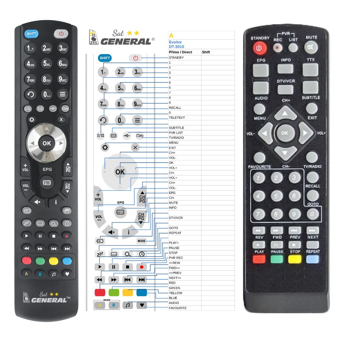 Ovladač je dodáván ve verzi značkového dálkového ovladače General SAT/TV (zobrazen vlevo). Garantujeme Vám, že dostanete ovladač, který plně nahradí Váš původní originální ovladač a bude mít naprosto všechny funkce stejné.