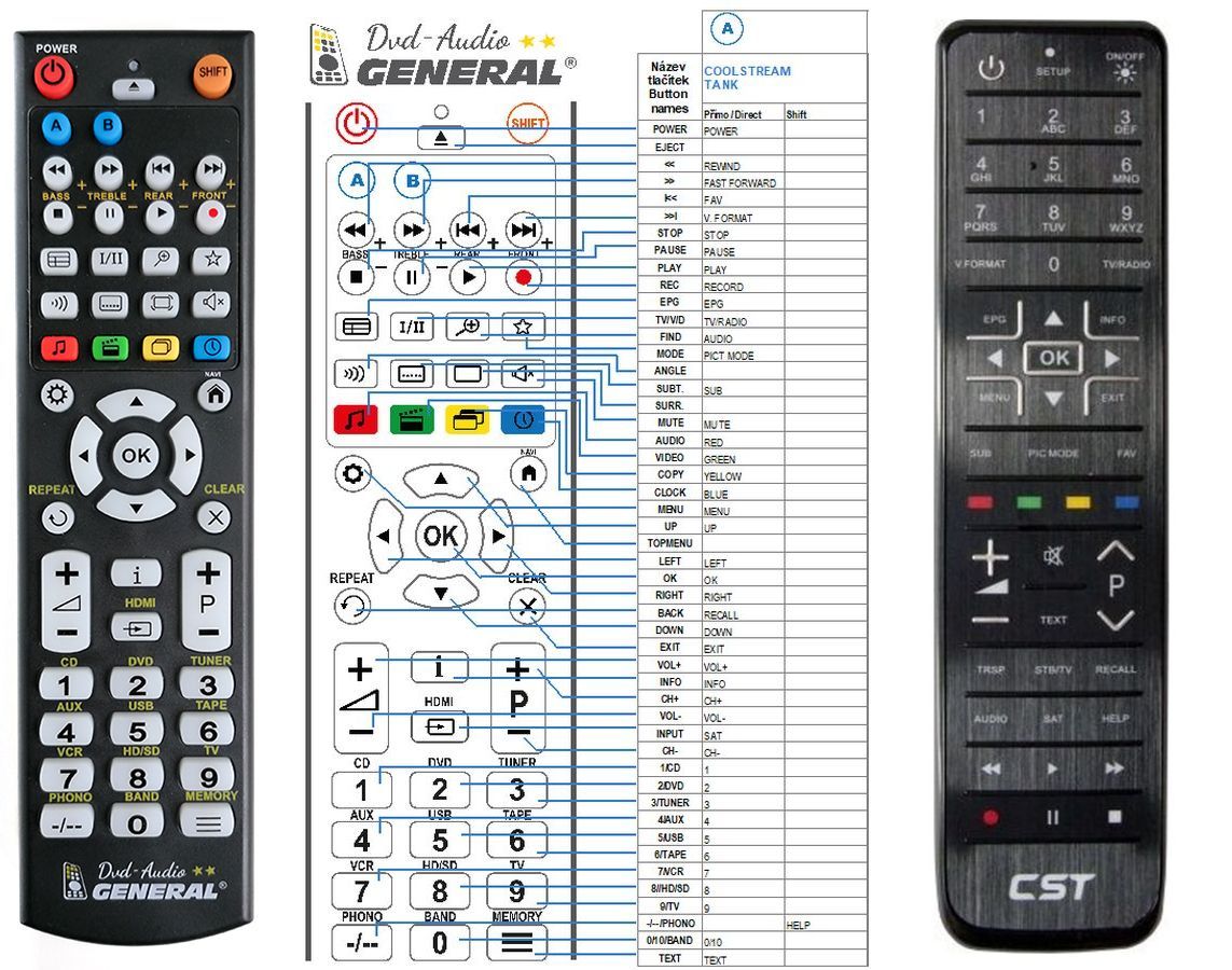 Ovladač je dodáván ve verzi značkového dálkového ovladače General DVD/AUDIO (zobrazen vlevo). Garantujeme Vám, že dostanete ovladač, který plně nahradí Váš původní originální ovladač a bude mít naprosto všechny funkce stejné.