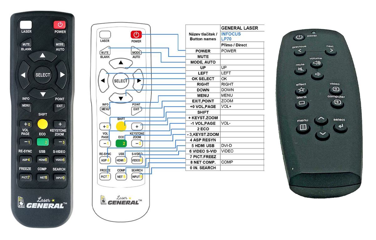 V případě, že v budoucnu vyměníte Váš projektor za jinou značku/model, jsme schopni Vám tento ovladač přeprogramovat na naprosto jakékoliv nové/á zařízení. Ovladač General LASER přežije Váš stávající přístroj!