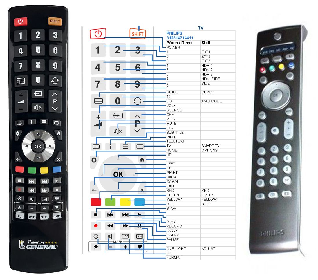 Není to univerzální ovladač, ale ovladač, který je naprogramován a přímo určen pro modely přístrojů uvedené výše. Není třeba žádné párování, žádné kódy. Obdržíte od nás ovladač, který je připraven k použití - jediné, co musíte udělat, je vložit baterie a ovladač hned funguje. Podívejte se na obrázek ovladače a ujistěte se, že jsou v tabulce všechny funkce jako na původním originálním ovladači.