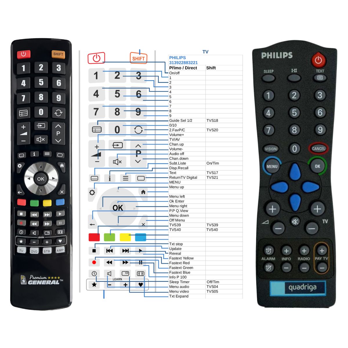 Ovladač je dodáván ve verzi značkového dálkového ovladače General Premium (zobrazen vlevo). Garantujeme Vám, že dostanete ovladač, který plně nahradí Váš původní originální ovladač a bude mít naprosto všechny funkce stejné.