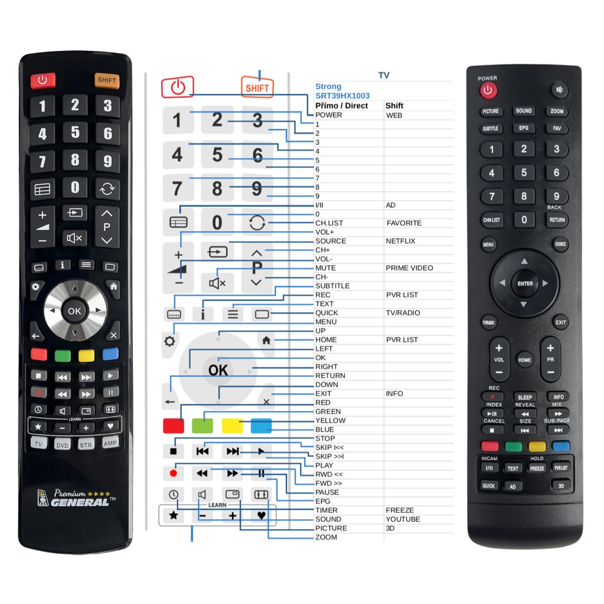 Máme skladem 45 typů dálkových ovladačů pro STRONG. Vyberte si originální dálkové ovladače pro STRONG, vysoce kvalitní náhradu General a Duremote nebo levný náhradní ovladač. Máme největší sklad dálkových ovladačů v Evropě.