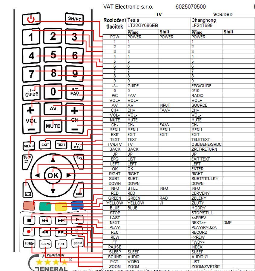 Ovladač je dodáván ve verzi značkového dálkového ovladače General Premium (zobrazen vlevo). Garantujeme Vám, že dostanete ovladač, který plně nahradí Váš původní originální ovladač a bude mít naprosto všechny funkce stejné.